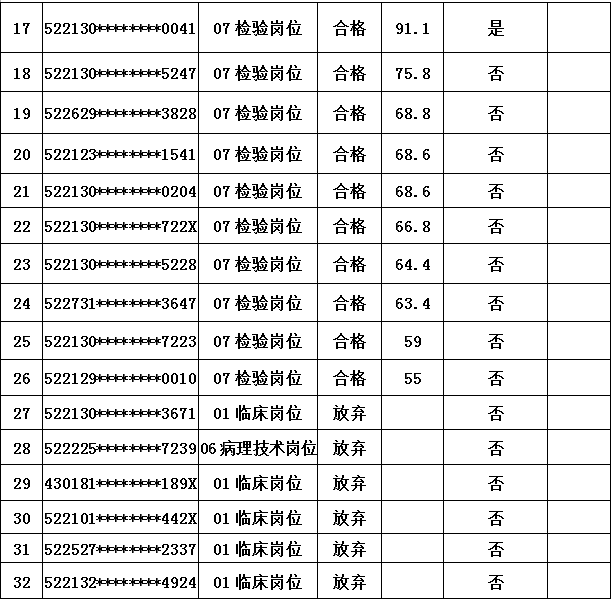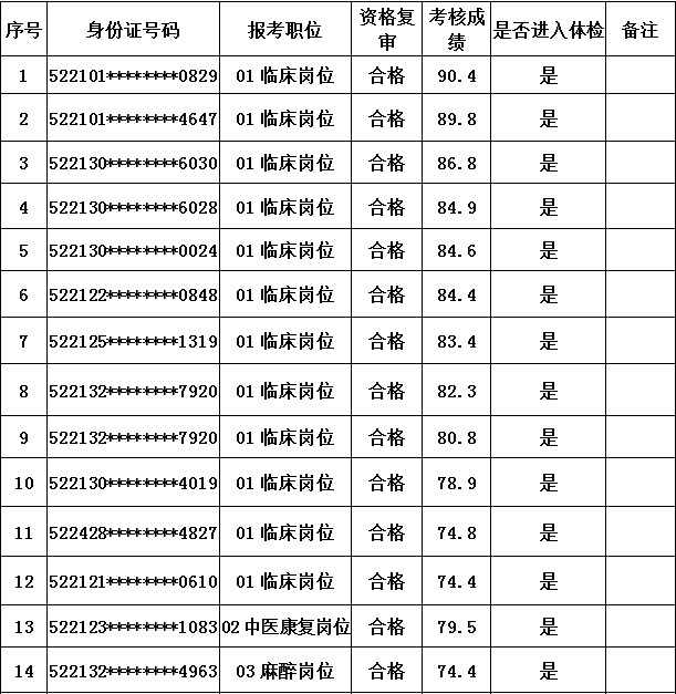 根据《仁怀市人民医院2020年公开招聘编制外专业技术人员简章》要求,仁怀市人民医院2021年1月12日已完成公开招聘编制外专业技术人员资格复审、考核,现将考核合格进入体检人员名单公示如下: