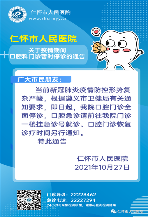 【通告】仁怀市人民医院关于疫情防控期间口腔科门诊暂时停诊的通告