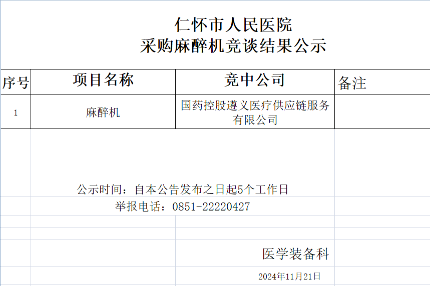 仁怀市人民医院采购麻醉机竞谈结果公示