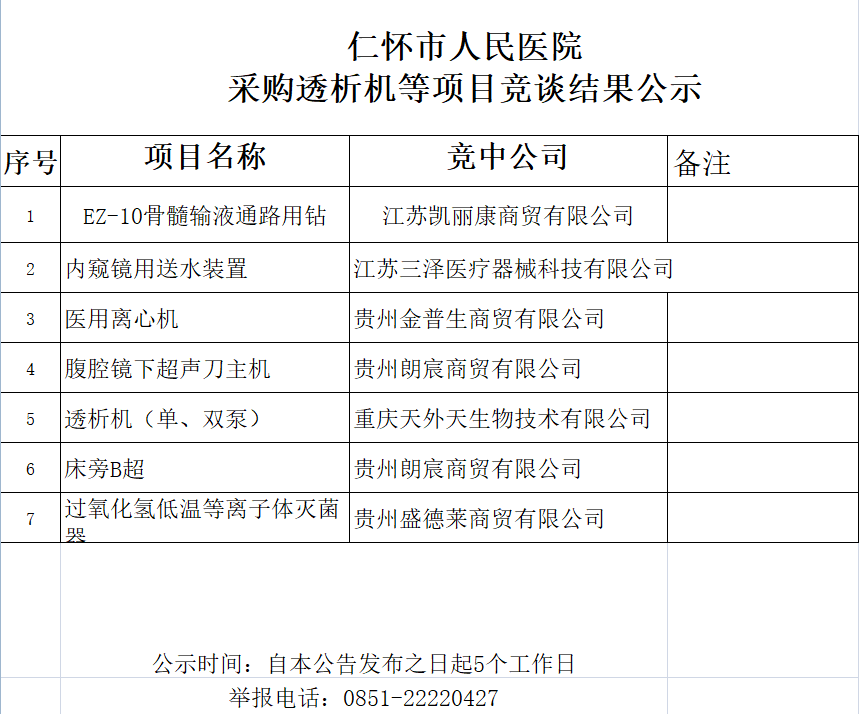 仁怀市人民医院采购透析机等项目竞谈结果公示