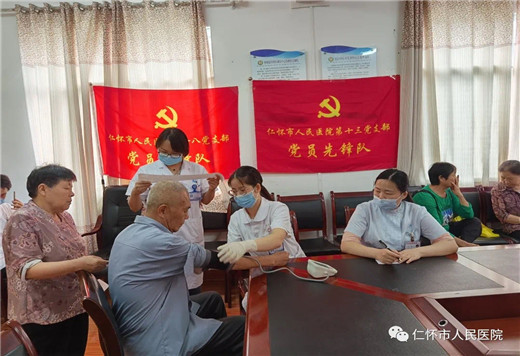 为推动我院医务人员深入学习习近平新时代中国特色社会主义思想,不忘初心、牢记使命。2020年7月13、14日,我院第十三、十八党支部联合盐津卫生院党支部在仁怀市城南社区进行以“关爱老年健康”为主题的义诊暨健康咨询活动。