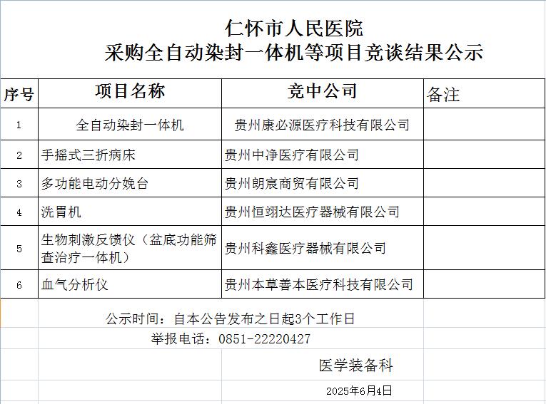 仁怀市人民医院采购全自动染封一体机等项目竞谈结果公示