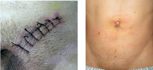 传统腹股沟疝修补(左图)与微创疝修补术(右图)疤痕比较