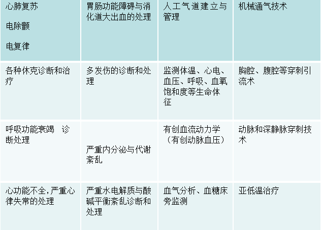 有创呼吸机12台、无创呼吸机 1台、高流量吸氧机3台、血液灌流机 1台、心电监护仪217台、血气分析仪1台、振动排痰仪2台、心电图机1台、亚低温治疗仪2台、除颤仪2台、纤维支气管镜1台、输液泵8台、微量注射泵20台、便携式监护仪2台、营养输注泵8台、便携式转运呼吸机1台、持续血液净化机1台,无创PICCO 1台。