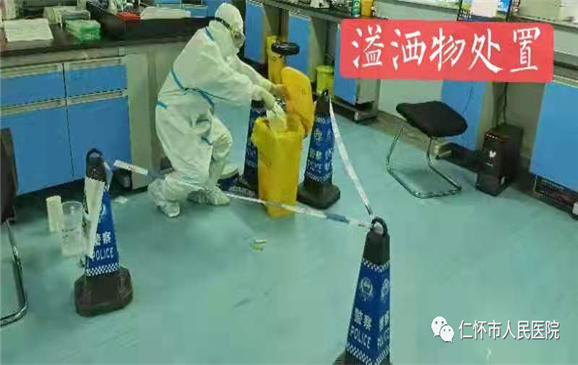 本次演练模拟在B3楼临检大厅,突然有不法人员打砸实验室玻璃后,强行进入,并用铁质钢管对实验室电脑、座椅、台面等进行打砸破坏,造成实验室损坏,并有患者血液打翻在地形成20×10cm的污染面。值班人员对外来人员劝阻,并拨打警务处电话求助并上报上级领导。上级领导立即启动《生物安全反恐应急救援处理预案》,将事故情况报告实验室生物安全应急领导小组,并由组长成立指挥中心,在安全领导小组的指挥协调下,警务人员迅速赶到现场控制外来人员,立即封锁现场警戒。生物安全员全身防护对打翻的待检样本进行消毒、灭菌等无害化处理。随后安全小组对此次事件进行生物安全评估,对相关人员进行医学观察,各项工作均按照预先制定的演练方案有条不紊地进行。演练结束后,生物安全小组成员针对此次演练做了简要点评,并提出建设性的改进意见。