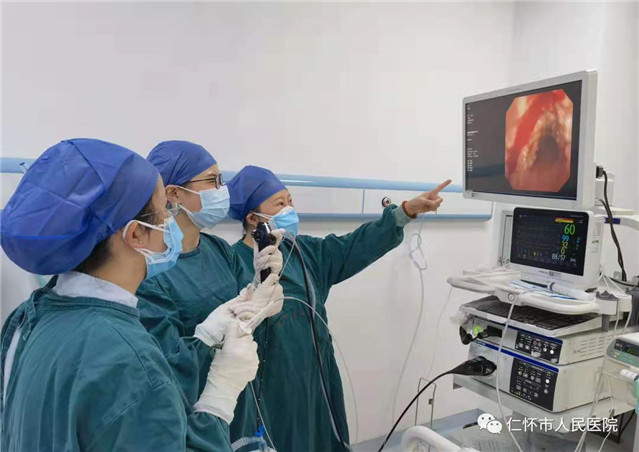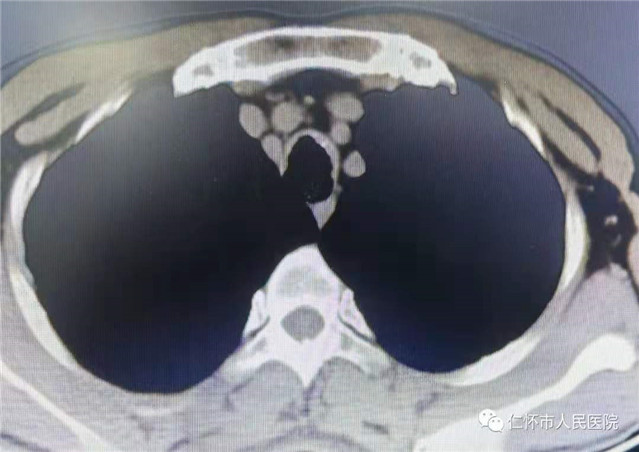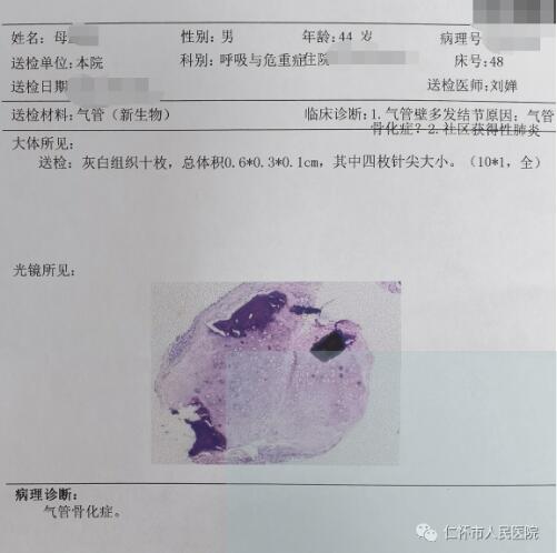 2021年5月24日,呼吸与危重症医学科刘婵副主任医师对患者行支气管镜检查,发现患者气管管腔不规则狭窄,前壁和侧壁黏膜下见多发大小不等、分布不均灰黄色的结节突向管腔,质硬,部分融合,刘婵在贵阳市第二人民医院(金阳医院)呼吸与危重症医学科帮扶专家何艳主任医师指导下成功取得病变组织10块送病理检查,后病理检查结果回示:气管骨化症。