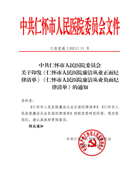 中共仁怀市人民医院委员会 关于印发《仁怀市人民医院廉洁从业正面纪 律清单》《仁怀市人民医院廉洁从业负面纪 律清单》的通知