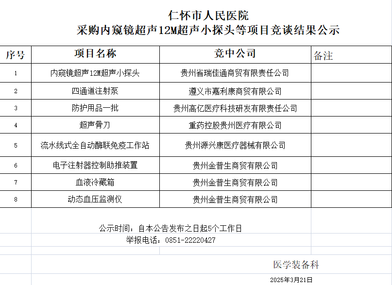 仁怀市人民医院采购内窥镜超声12M超声小探头等项目竞谈结果公示