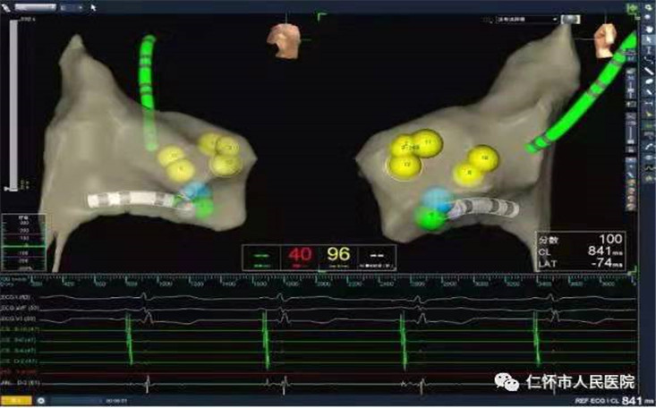 手术当天,赵主任、苏医生充分进行术前准备,谨慎操作。从穿三针股静脉、放置电极到行心内电生理检查,证实为房室结折返性心动过速慢快型,最后在Ensite三维标测系统指导下行房室结慢径路改良,术后异丙肾上腺素下反复冠状窦S1S2、S1S2S3刺激均未诱发心动过速、未见跳跃及回波,手术非常成功。术后复查心电图正常,患者现已康复出院。此手术的开展真正让患者做到通过一次微创手术获益终生,彻底告别心慌、心悸,心律失常,真正从“根”治疗,术后也无需再口服药物。