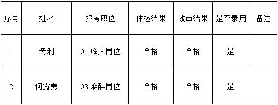 根据《仁怀市人民医院2020年公开招聘编制外专业技术人员简章》要求,仁怀市人民医院2021年8月2日已完成公开招聘编制外专业技术人员体检、政审工作,现将体检、政审合格的第二批拟录用人员名单公示如下: