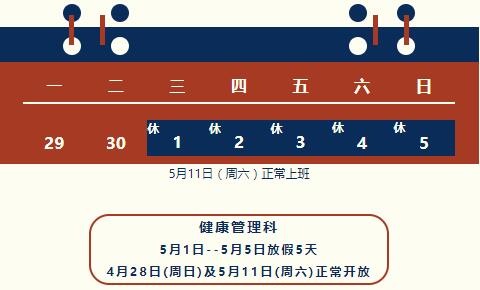 亲爱的患者朋友们: 五一劳动节来临,根据国家放假安排,5月1日至5月5日,放假共5天,5月11日(周六)正常上班。 为确保假期医院正常诊疗秩序和安全稳定,为患者提供优质、高效、便捷的诊疗服务,五一劳动节放假期间我院门诊按无假日排班出诊,为减少您的排队等候时间,建议您通过我院微信公众号“仁怀市人民医院”进行预约挂号,错峰就诊。 无假日门诊出诊时间 8:00-12:00 12:40-16:00 门诊咨询电话 0851-22317309 0851-22228462